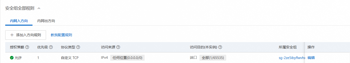 登录阿里云控制台,找到对应的 ECS 实例,进入安全组设置页面。添加安全组规则,允许 FTP 服务相关端口的访问。如果是主动模式,需开放 21 端口(控制连接);如果使用被动模式,除了 21 端口,还需开放配置的被动模式端口范围(例如 40000 - 40100)。方便起见,这里我把入方向和出方向都配置成了所有端口。