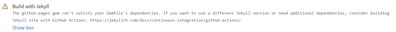 这是因为默认的pages-build-deployment工作流没有去下载所需要的依赖,而缺少了Jekyll模板。解决这个问题的方法也很简单,就是自己创建一个工作流保证每一次都能把所需要的依赖装好。