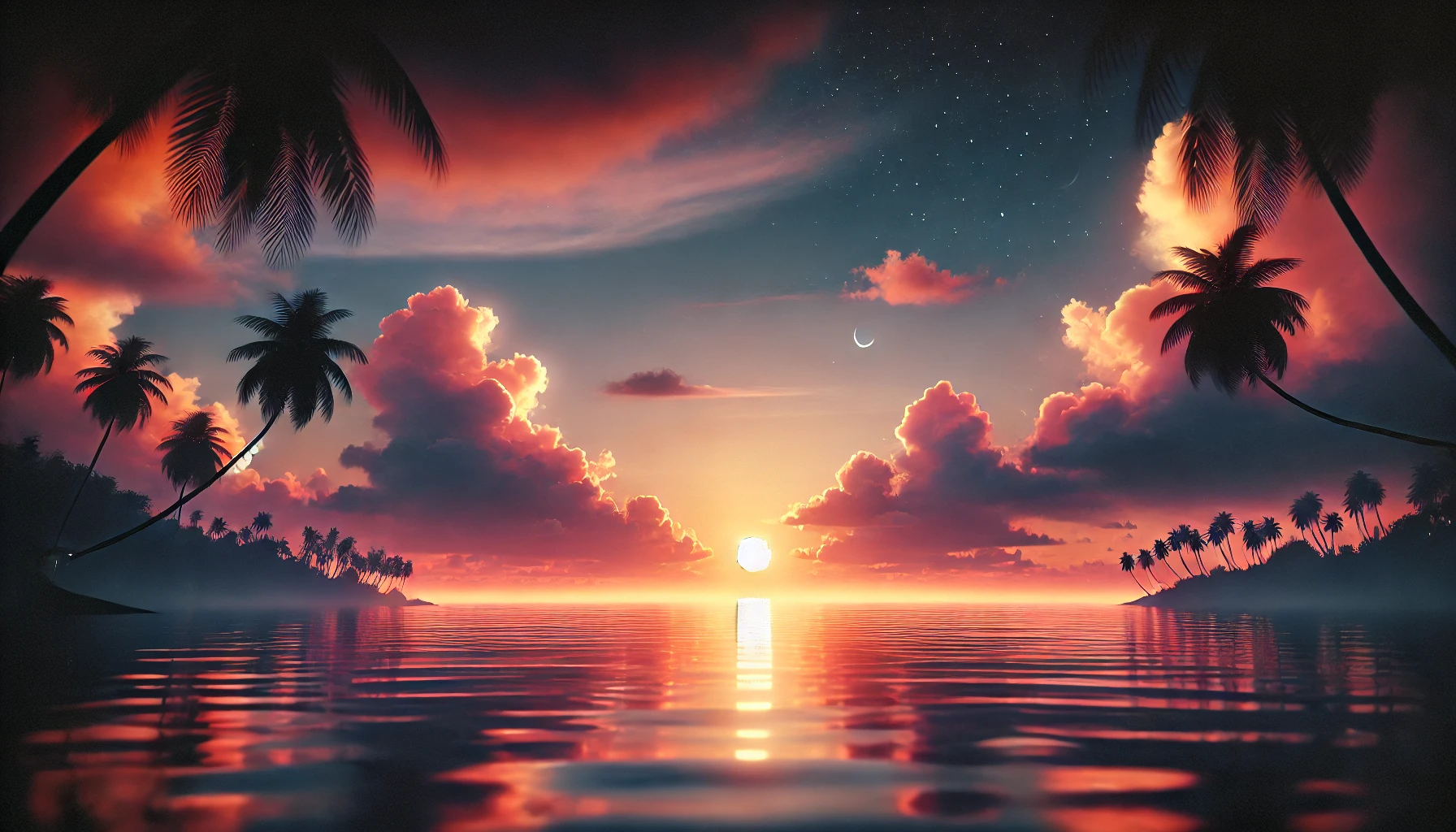 with soft waves reflecting the warm orange and pink hues of the sky, a few scattered clouds, and silhouetted palm trees framing the scene.